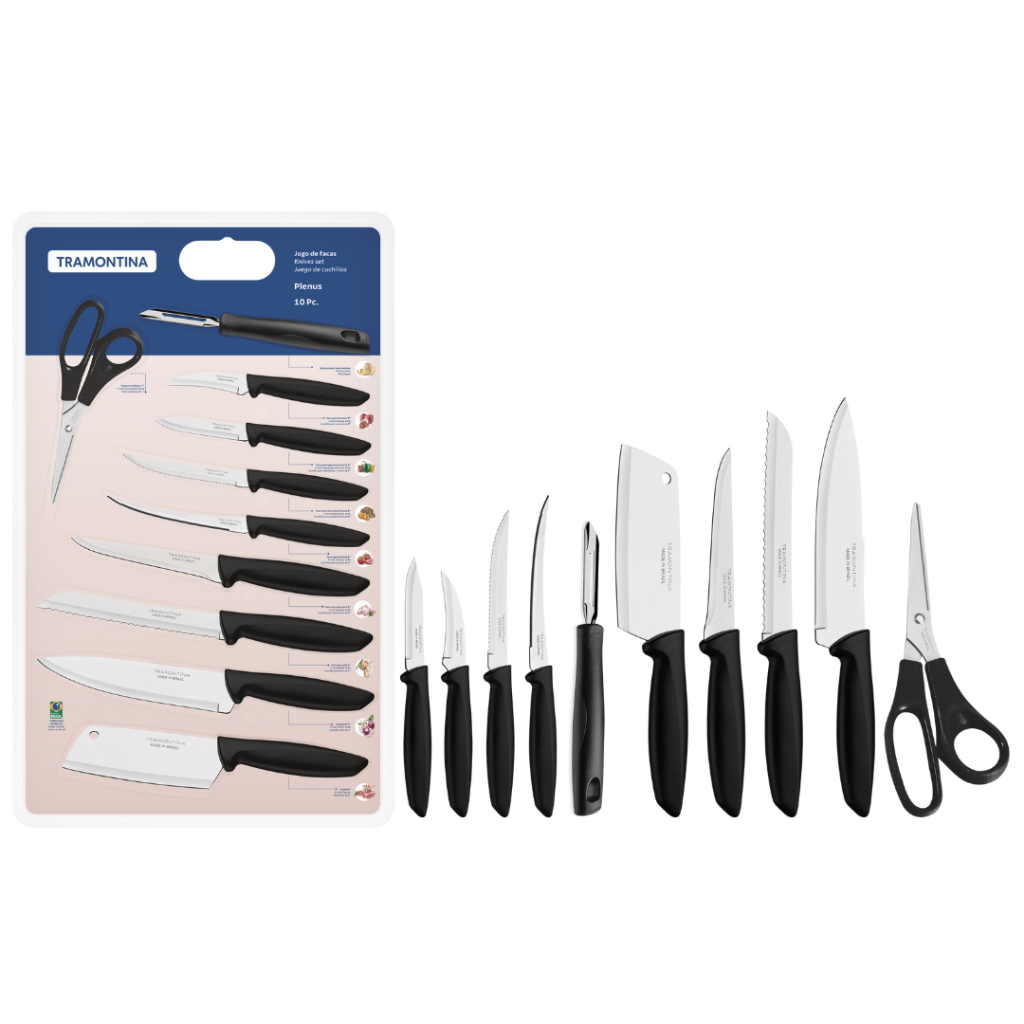 Sua cozinha ganhará maior funcionalidade e versatilidade com o jogo de facas Tramontina Plenus com lâminas em aço inox e cabos de polipropileno preto 10 peças. Com peças essencias para o preparo das suas refeições do dia a dia, como facas, cutelo, descascador e tesoura, ele vai deixar o preparo de suas receitas ainda mais fácil.