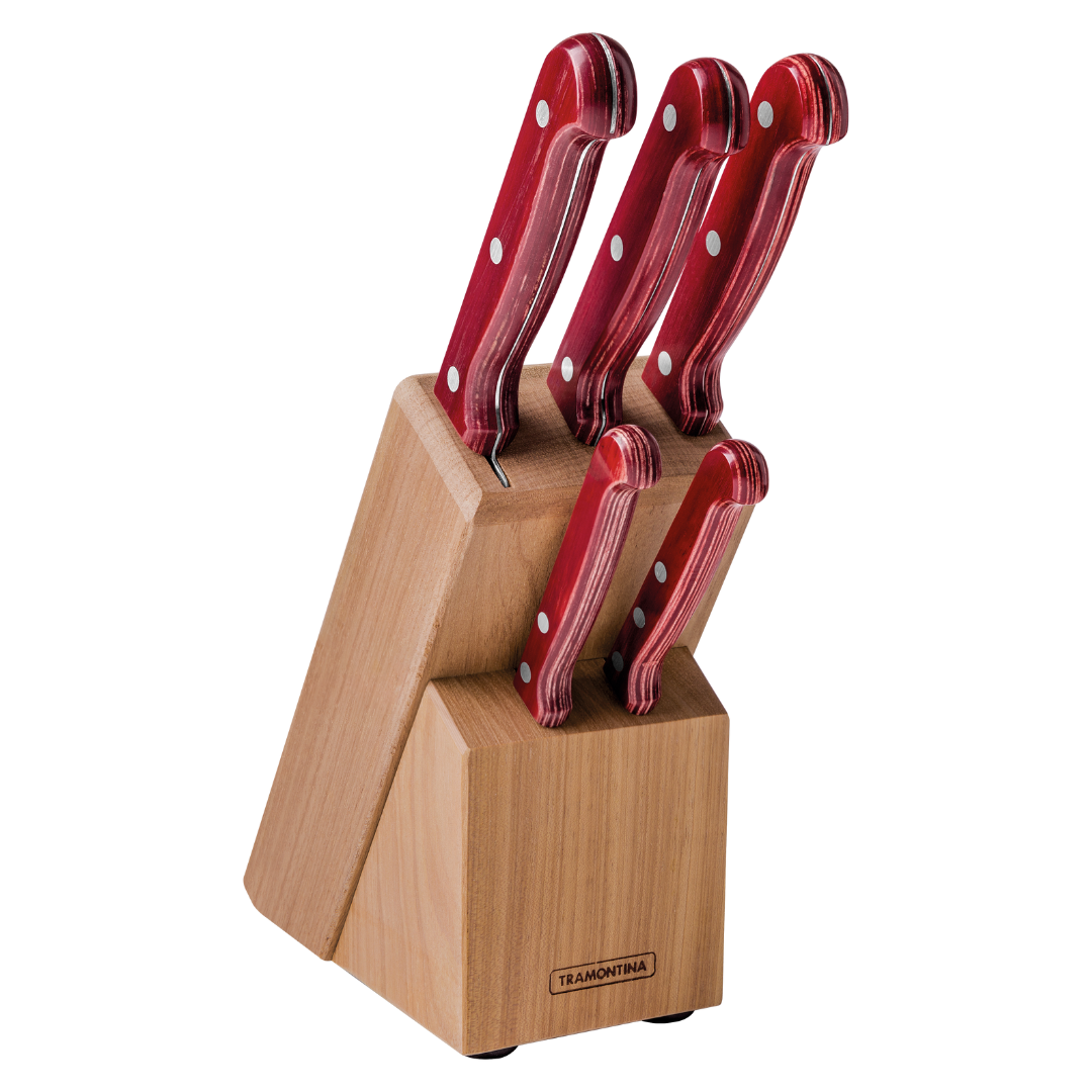 Jogo de Facas Tramontina Polywood com Lâminas em Aço Inox e Cabos de Madeira Tratada Vermelho com Suporte de Madeira 6 Peças
